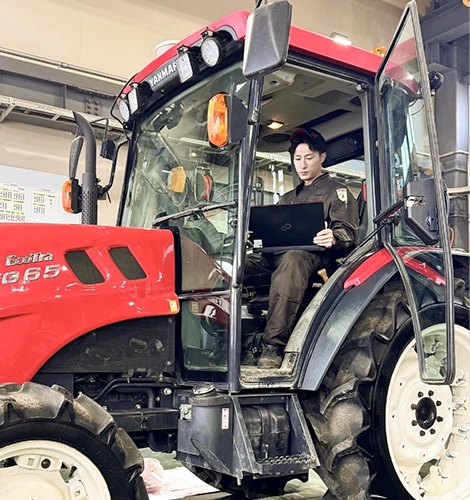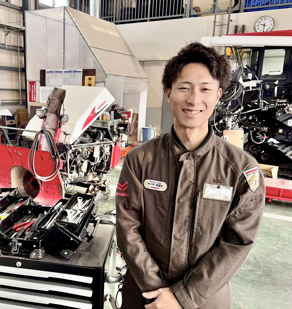 私は自動車整備の専門学校に在学していて、元々は自動車ディーラーに勤務しようとしていました。ですが、私自身整備も大好きではありましたが、お客様とお話しするのが好きでもっとお客様との距離が近い仕事がないか、そんな事を考えているうちに弊社をみつけ、ヤンマーでは整備士が実際にお客様の家に行き、現場での出張修理があったり、整備士自らお客様に整備を提案したりするなどといった業務内容を知り、これこそ、自分の求めていた整備士の姿だと感じ入社することを決めました。